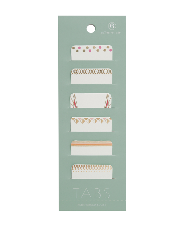 Durable and beautiful, these thick cardboard tabs feature premium paper and pre-scored fold lines to help prevent breakage. Peel and stick adhesive makes it easy to stay organized. Foil stamped on both sides. 6 tabs per packet.