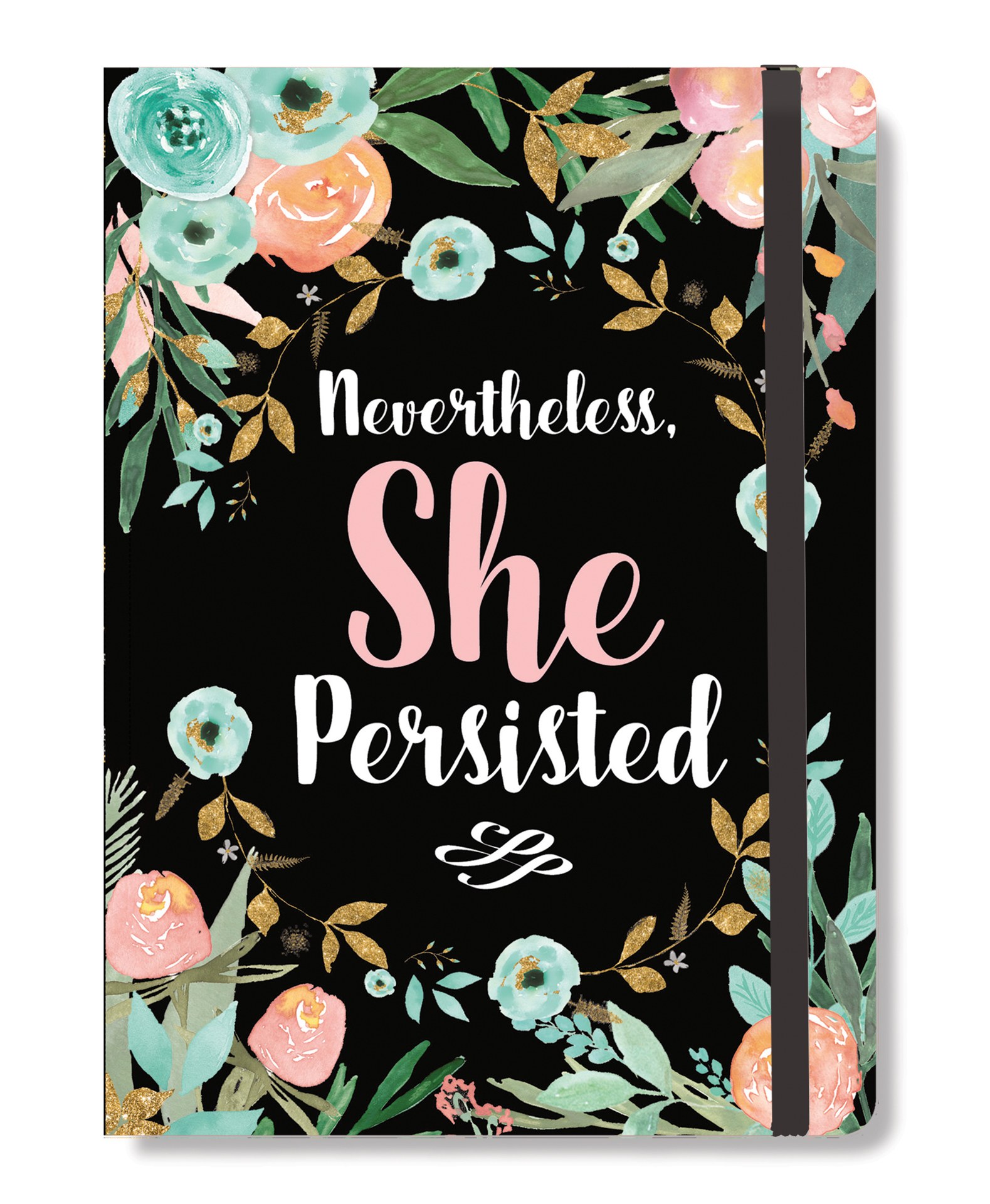 Challenges to face? Mountains to climb? Issues to address? Clarify feelings, engage with your thoughts, process emotions, set goals, and consider opportunities. Write it all out here, within the pages of this motivating and elegant journal.160 lightly lined pages are provided for writing, sketching, or jotting down ideas.Acid-free archival-quality paper takes pen or pencil beautifully.On front and back covers: Sophisticated florals, a matte black background, and the words ''Nevertheless, She Persisted'' in brush script.Gloss highlights, gold foil detailing, and raised embossing add polish.Complementary coral interior endpapers complement the design.A black elastic band attached to the back cover keeps your place or keeps journal closed.Includes an inside back cover pocket.The small-format size (5 inches wide by 7 inches high) fits easily in most bags and backpacks.
