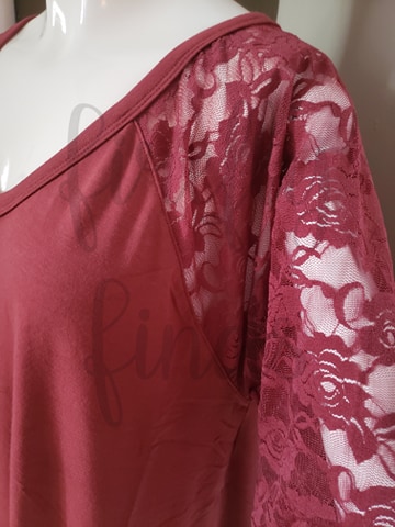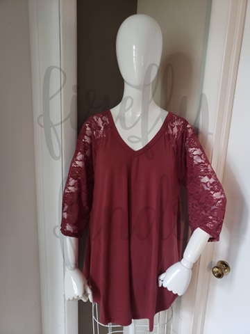 Lace Detail 3/4 length sleeve Material: 57% polyester 38% rayon 5% spandex Brand- Zenana Color- Brick Size 1x
