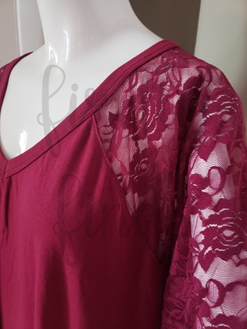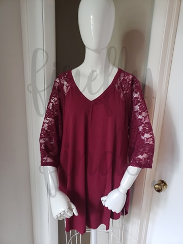 Lace Detail 3/4 length sleeve Material: 57% polyester 38% rayon 5% spandex Brand- Zenana Color- Wine Size 2x