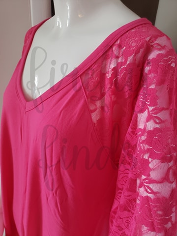 Lace Detail 3/4 length sleeve Material: 57% polyester 38% rayon 5% spandex Brand- Zenana Color- Pink Size 1x