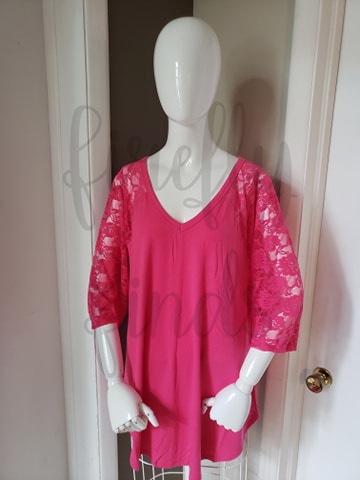 Lace Detail 3/4 length sleeve Material: 57% polyester 38% rayon 5% spandex Brand- Zenana Color- Pink Size 2x