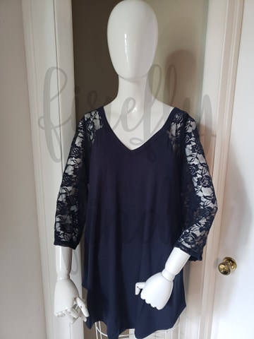 Lace Detail 3/4 length sleeve Material: 57% polyester 38% rayon 5% spandex Brand- Zenana Color- Navy Size 1x