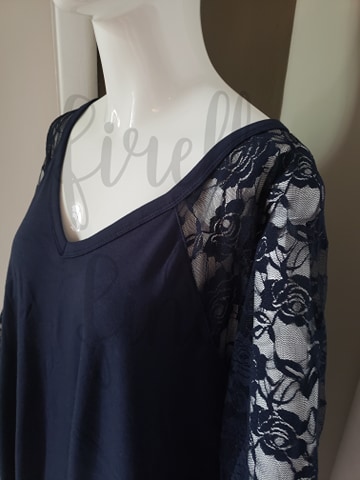 Lace Detail 3/4 length sleeve Material: 57% polyester 38% rayon 5% spandex Brand- Zenana Color- Navy Size Large