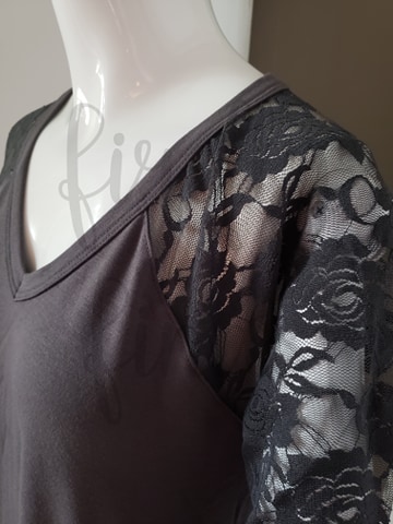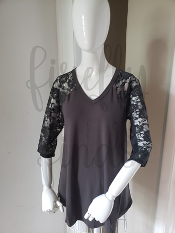 Lace Detail 3/4 length sleeve Material: 57% polyester 38% rayon 5% spandex Brand- Zenana Color- Ash Grey Size Small