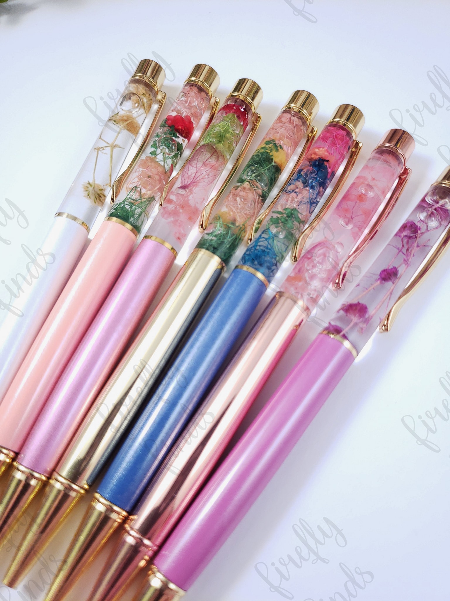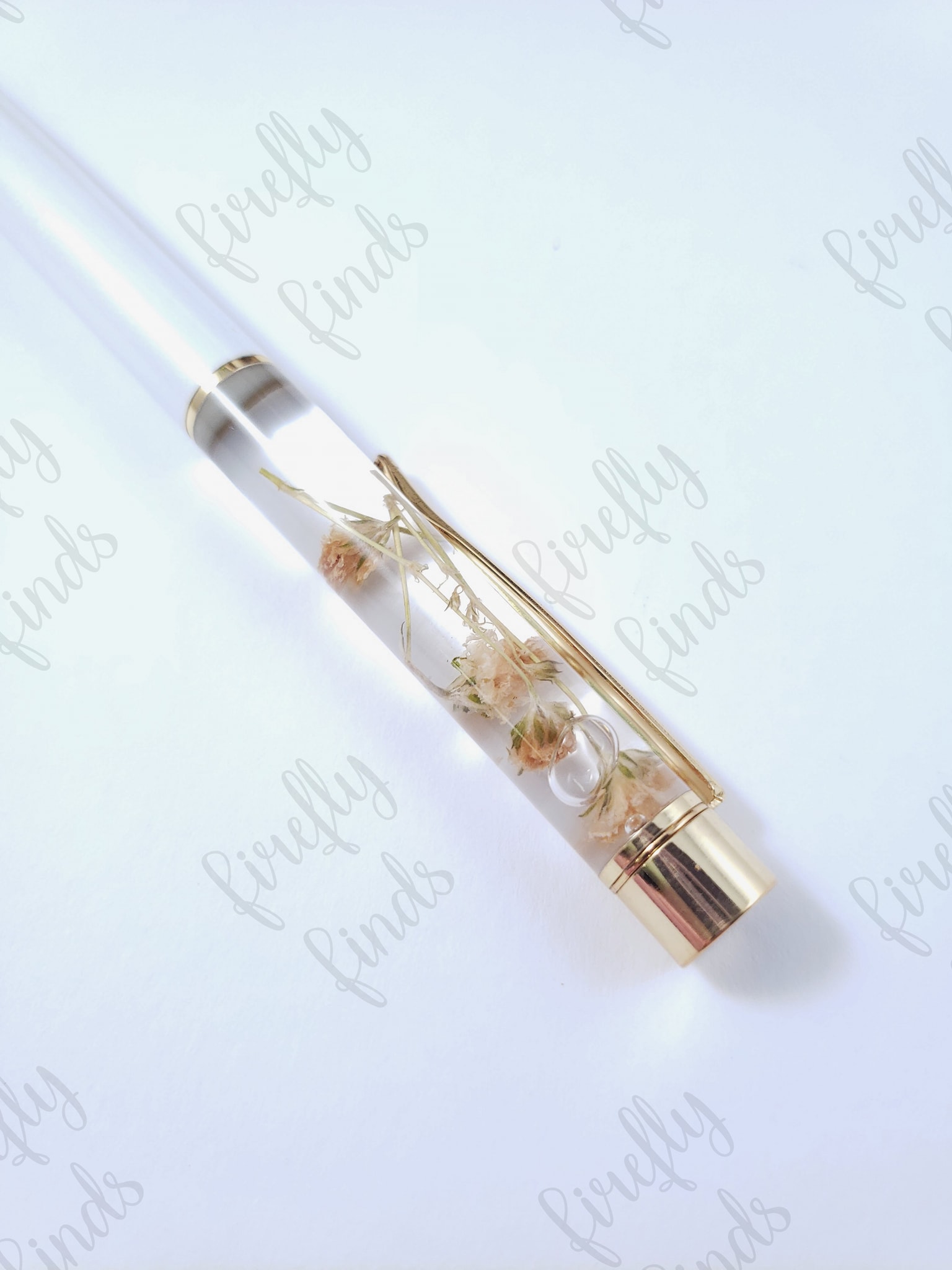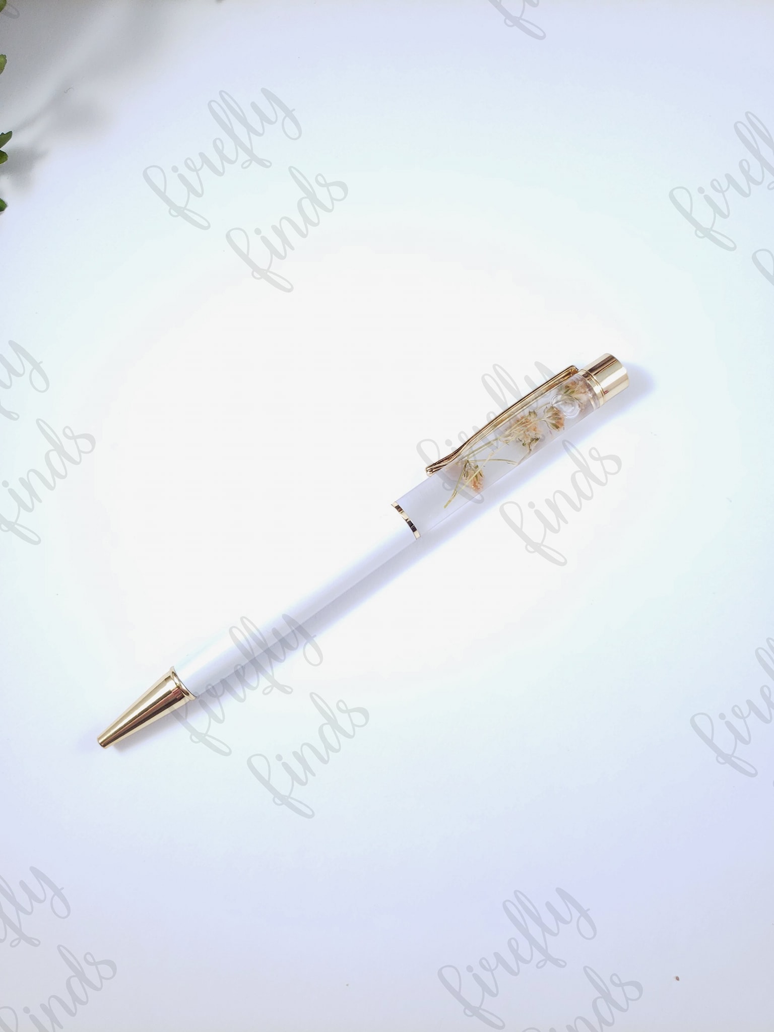 The barrel of the pen is White, with gold hardware and is filled with delicate gold flowers.
