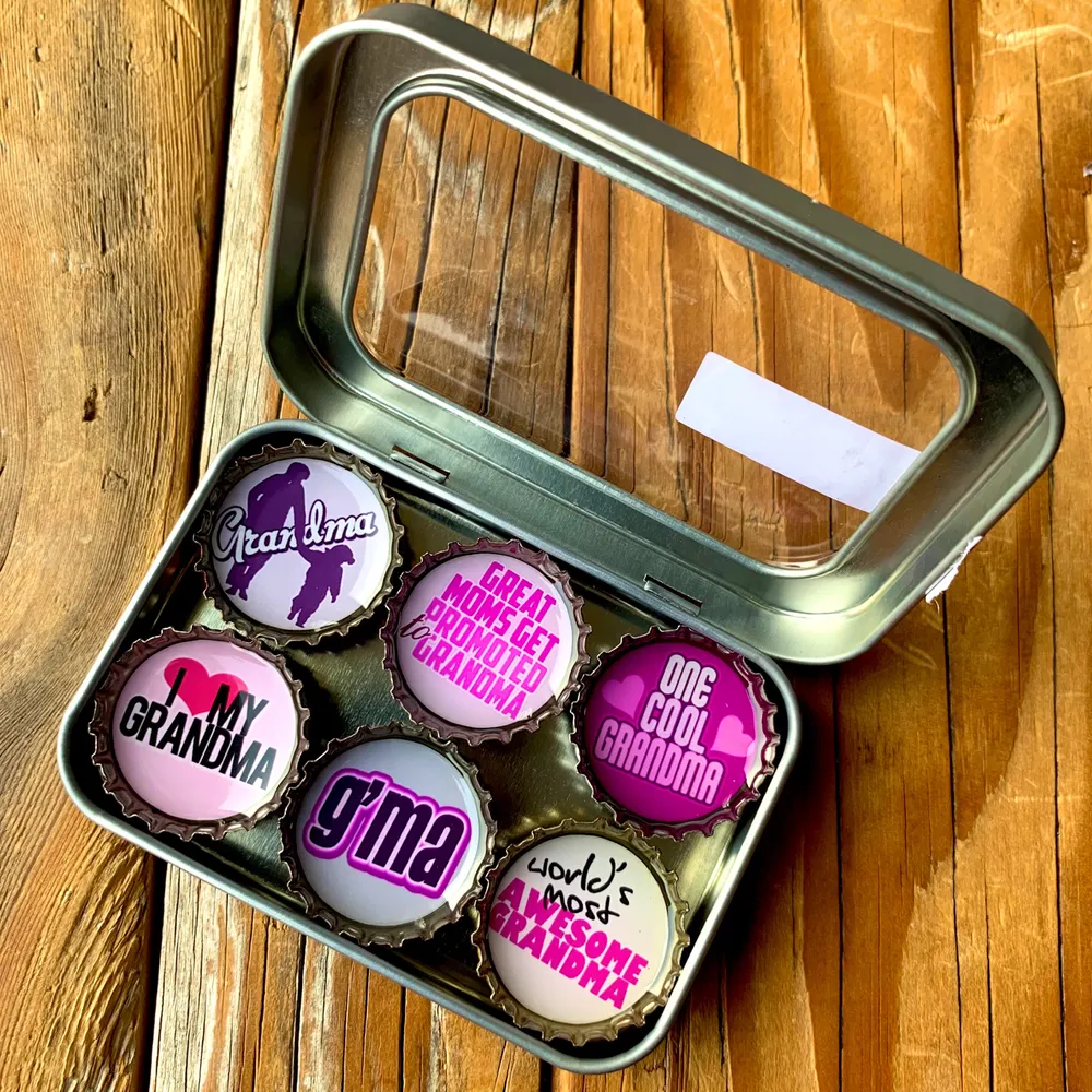 Kate's Magnets creates adorable handmade bottle cap magnets from recycled materials. This set of 6 features fun designs that any grandma will love!